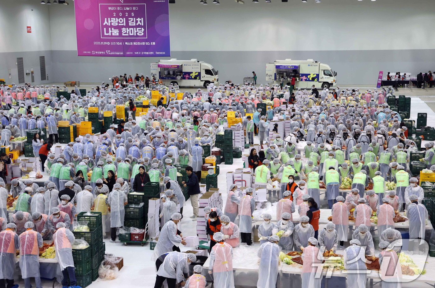 (부산=뉴스1) 윤일지 기자 = 19일 부산 해운대구 벡스코 제2전시장에서 열린 '2025 사랑의 김치나눔 한마당'에서 자원봉사자들이 김장을 하고 있다. 후원 기업·기관 임직원, 자원봉사자 등 1000여 명이 정성스레 담근 김장김치 1만여 포기는 부산지역 독거노인 가정 등 6200여 세대에 가구당 5㎏씩 전달된다. 2025.11.19/뉴스1