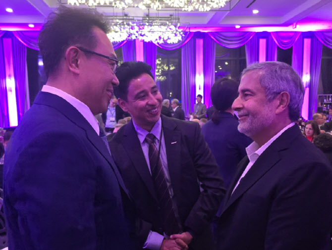 박성훈(왼쪽) 씨엠티엑스 대표와 산제이 메흐로트라(오른쪽) 마이크론 CEO가 지난 13일 미국 샌프란시스코에서 열린 마이크론 서플라이어 어워드에서 만나 환담하고 있다. (사진=씨엠티엑스) |