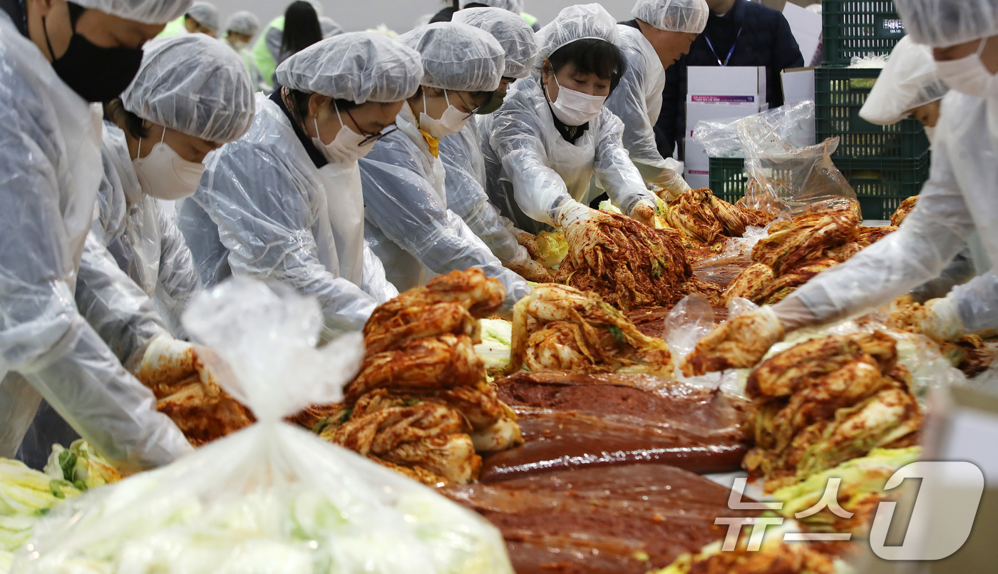 (부산=뉴스1) 윤일지 기자 = 19일 부산 해운대구 벡스코 제2전시장에서 열린 '2025 사랑의 김치나눔 한마당'에서 자원봉사자들이 김장을 하고 있다. 후원 기업·기관 임직원, 자원봉사자 등 1000여 명이 정성스레 담근 김장김치 1만여 포기는 부산지역 독거노인 가정 등 6200여 세대에 가구당 5㎏씩 전달된다. 2025.11.19/뉴스1