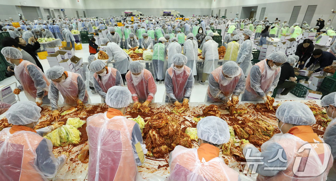 (부산=뉴스1) 윤일지 기자 = 19일 부산 해운대구 벡스코 제2전시장에서 열린 '2025 사랑의 김치나눔 한마당'에서 자원봉사자들이 김장을 하고 있다. 후원 기업·기관 임직원, 자원봉사자 등 1000여 명이 정성스레 담근 김장김치 1만여 포기는 부산지역 독거노인 가정 등 6200여 세대에 가구당 5㎏씩 전달된다. 2025.11.19/뉴스1