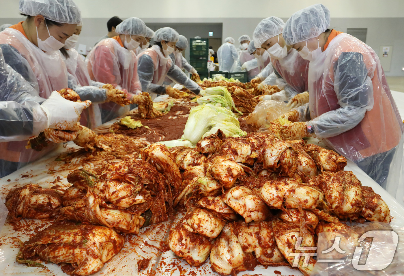 (부산=뉴스1) 윤일지 기자 = 19일 부산 해운대구 벡스코 제2전시장에서 열린 '2025 사랑의 김치나눔 한마당'에서 자원봉사자들이 김장을 하고 있다. 후원 기업·기관 임직원, 자원봉사자 등 1000여 명이 정성스레 담근 김장김치 1만여 포기는 부산지역 독거노인 가정 등 6200여 세대에 가구당 5㎏씩 전달된다. 2025.11.19/뉴스1