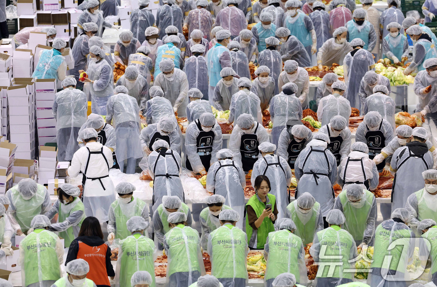 (부산=뉴스1) 윤일지 기자 = 19일 부산 해운대구 벡스코 제2전시장에서 열린 '2025 사랑의 김치나눔 한마당'에서 자원봉사자들이 김장을 하고 있다. 후원 기업·기관 임직원, 자원봉사자 등 1000여 명이 정성스레 담근 김장김치 1만여 포기는 부산지역 독거노인 가정 등 6200여 세대에 가구당 5㎏씩 전달된다. 2025.11.19/뉴스1
