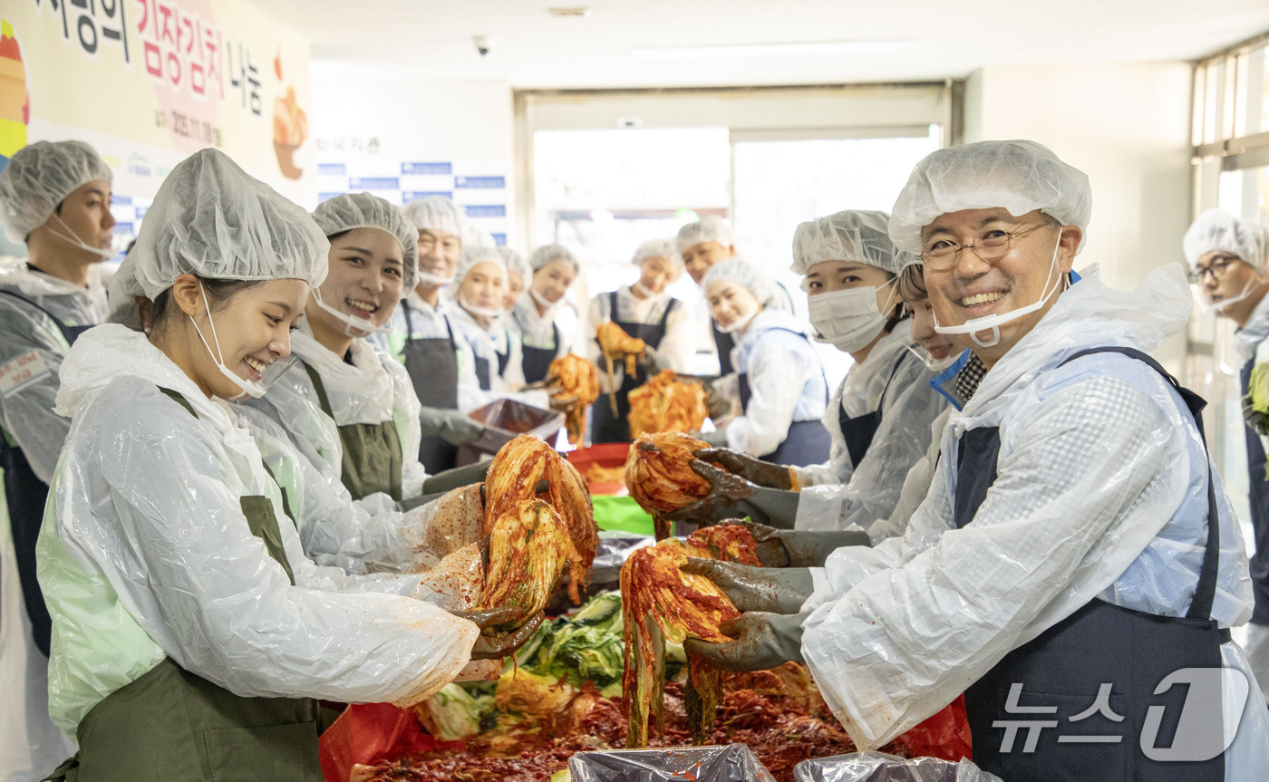 진에어·에어부산·에어서울 임직원들이 18일 서울 강서 등촌9동종합사회복지관에서 3사 합동 김장 봉사에 참여하는 모습(진에어 제공). 2025.11.18. |