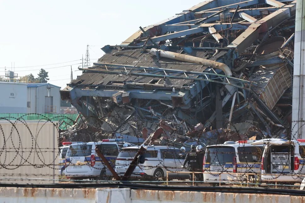18일 오후 경찰과 고용노동부, 국립과학수사연구원, 한국산업안전보건공단 등 관계자들이 울산 남구 한국동서발전 울산화력발전소 보일러동 붕괴 사고 현장에서 합동감식을 벌였다. 연합뉴스 |