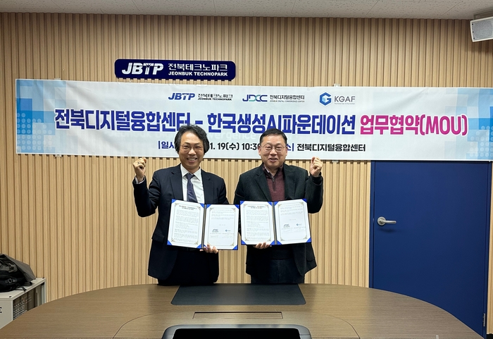 전북테크노파크 부설기관 전북디지털융합센터(센터장 최대규)는 19일, 사단법인 한국생성AI파운데이션(KGAF·회장 송세경)과 전북을 중심으로 한 국가 인공지능 전환(AX) 교육센터 구축 및 운영 생태계 조성을 위한 업무협약을 체결한다.