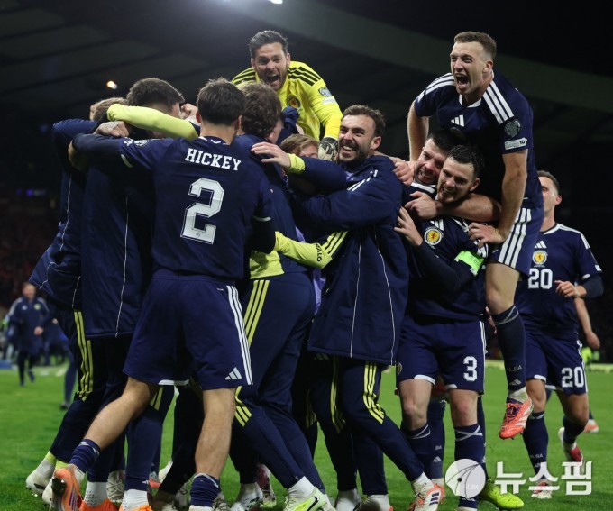 [스코틀랜드=뉴스핌] 박상욱 기자=스코틀랜드의 케니 맥린이 19일(한국시간) 월드컵 유럽예선 C조 최종전 후반 추가시간에서 골을 넣자 동료 선수과 함께 기뻐하고 있다. 2025.11.19 psoq1337@newspim.com |