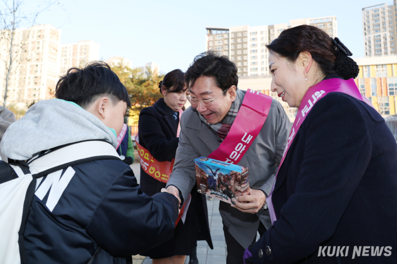 원강수 원주시장이 19일 오전 샘마루초등학교 정문에서 진행된 ‘어린이 실종·유괴 예방 캠페인’에 참여해 안전교육을 강조했다.
