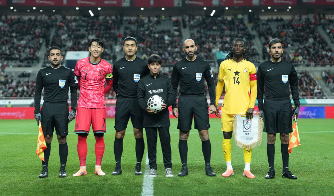 하나은행은 지난 18일 서울월드컵경기장에서 열린 대한민국과 가나의 축구 국가대표팀 A매치 경기에서 이주배경 가정 아동·청소년들에게 매치볼 키드와 기수단 참여 경험을 제공했다. 경기 시작에 앞서 아프가니스탄 출신 매치볼 키드 마시(Masih)가 양 팀 주장 및 심판진과 함께 기념촬영을 하고 있다. 사진=하나은행 제공 |