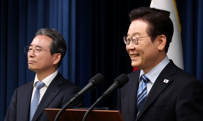 이재명 대통령이 14일 서울 용산 대통령실 기자회견장에서 한미 팩트시트 타결과 관련해 발표를 마친 뒤 취재진 질문에 답하고 있다. 왼쪽은 김용범 정책실장. 연합뉴스 |