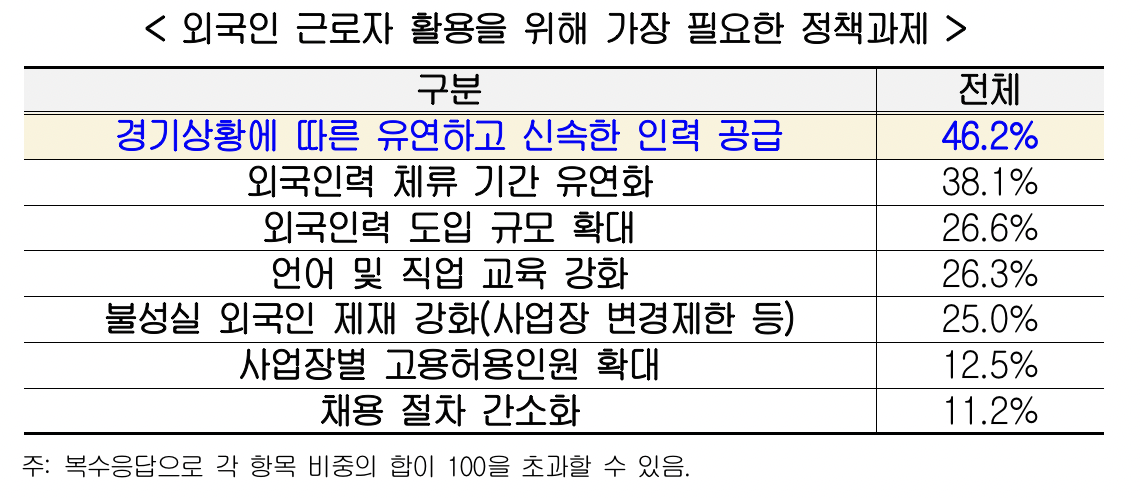 외국인 근로자 활용을 위해 필요한 정책과제로는 ‘경기 상황에 따른 유연하고 신속한 인력 공급’이 46.2%로 가장 많이 선택됐다.
