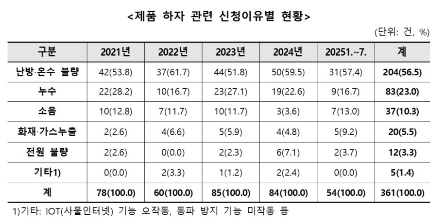 제품 하자의 경우 난방·온수 불량이 56.5%(204건)로 절반 이상을 차지했고, 누수(23.0%), 소음(10.3%) 등의 순이었다. 설치 불만 사례에서는 배관·연통 등 주요 부품 오설치가 69.5%(114건)로 가장 많았다.