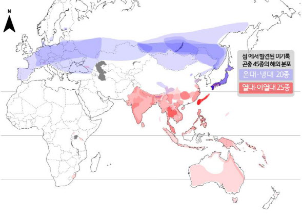 섬에서 발견된 미기록종 곤충의 해외 분포도. 색이 진할수록 많은 종이 분포하고 있다.(사진=기후부) |