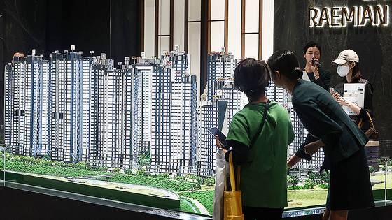 7일 오후 서울 송파구 래미안갤러리에서 시민들이 반포 래미안 트리니원 견본주택을 보고 있다. 뉴스1 |