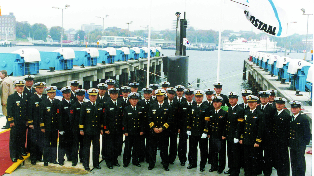 ▲ 1992년 10월 14일 독일 HDW 조선소에서 열린 장보고함 인수식에서 인수 승조원들이 기념 촬영하는 모습
