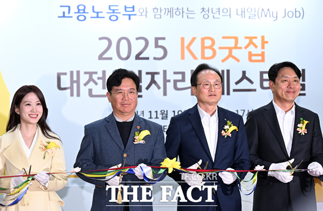 [더팩트ㅣ대전=이새롬 기자] 19일 대전컨벤션센터 제2전시장에서 '고용노동부와 함께하는 청년의 내일(My Job), 2025 KB굿잡 대전 일자리 페스티벌' 개막식이 열린 가운데, 김영훈 고용노동부 장관을 비롯한 참석자들이 테이프 커팅을 하고 있다. 왼쪽부터 KB국민은행 홍보모델 배우 박은빈, 김 장관, 이환주 KB국민은행장, 최성아 대전광역시 정무경제과학 부시장.