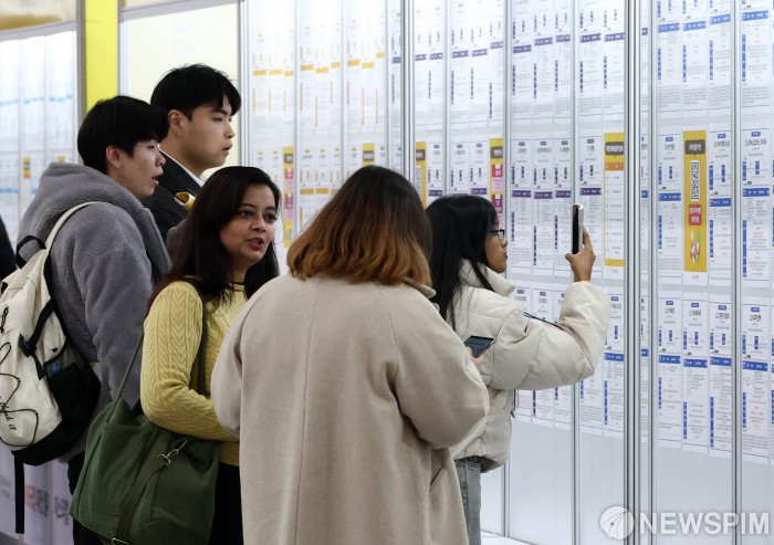 [대전=뉴스핌] 최지환 기자 = 19일 대전 유성구 컨벤션센터에서 열린 2025 KB굿잡 대전 일자리 페스티벌에서 인도에서 온 유학생들이 채용공고를 살펴보고 있다. 2025.11.19 choipix16@newspim.com