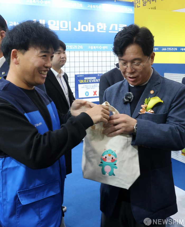 [대전=뉴스핌] 최지환 기자 = 김영훈 고용노동부 장관이 19일 대전 유성구 컨벤션센터에서 열린 2025 KB굿잡 대전 일자리 페스티벌에서 고용복지센터 부스를 방문해 고용노동부 캐릭터 '고드래곤' 굿즈를 받고 있다. 2025.11.19 choipix16@newspim.com