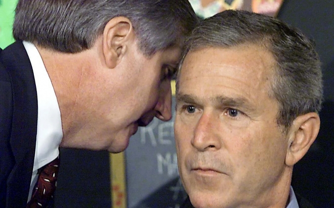 2001년 9월 11일 미국 플로리다주 한 초등학교에서 보좌진으로부터 뉴욕 테러 소식을 보고받는 조지 W. 부시 당시 대통령의 모습. AFP 연합뉴스 |