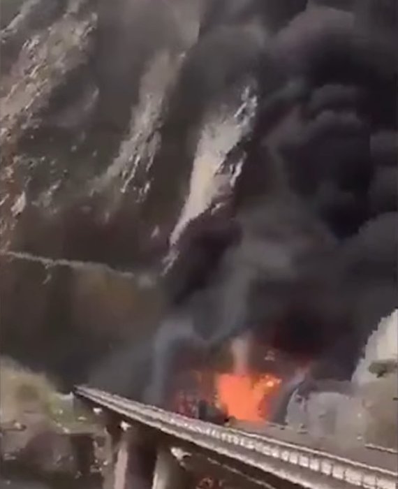 지난 17일(현지시간) 사우디아라비아 메디나 인근에서 인도에서 온 순례객 46명을 태운 버스가 탱크로리와 충돌해 화재가 발생하면서 1명을 제외한 45명이 현장에서 사망했다. 사고 직후 불길에 휩싸인 버스 모습. (출처: 뉴스 캡처) |