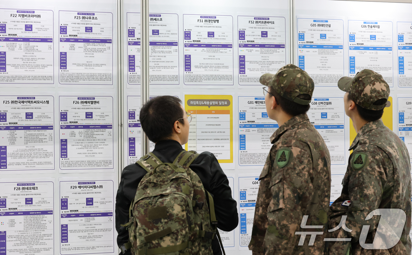 (대전=뉴스1) 김기태 기자 = 19일 대전컨벤션센터에서 고용노동부와 KB국민은행, 대전시가 공동 주최로 열린 '고용노동부와 함께하는 청년의 내일(My Job), 2025 KB굿잡 대전 일자리 페스티벌'에서 군장병이 채용정보를 살피고 있다. 2025.11.19/뉴스1