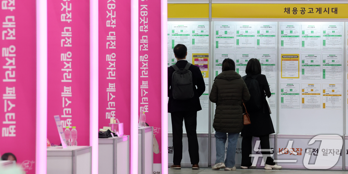 (대전=뉴스1) 김기태 기자 = 19일 대전컨벤션센터에서 고용노동부와 KB국민은행, 대전시가 공동 주최로 열린 '고용노동부와 함께하는 청년의 내일(My Job), 2025 KB굿잡 대전 일자리 페스티벌'에서 구직자들이 채용정보를 살피고 있다. 2025.11.19/뉴스1