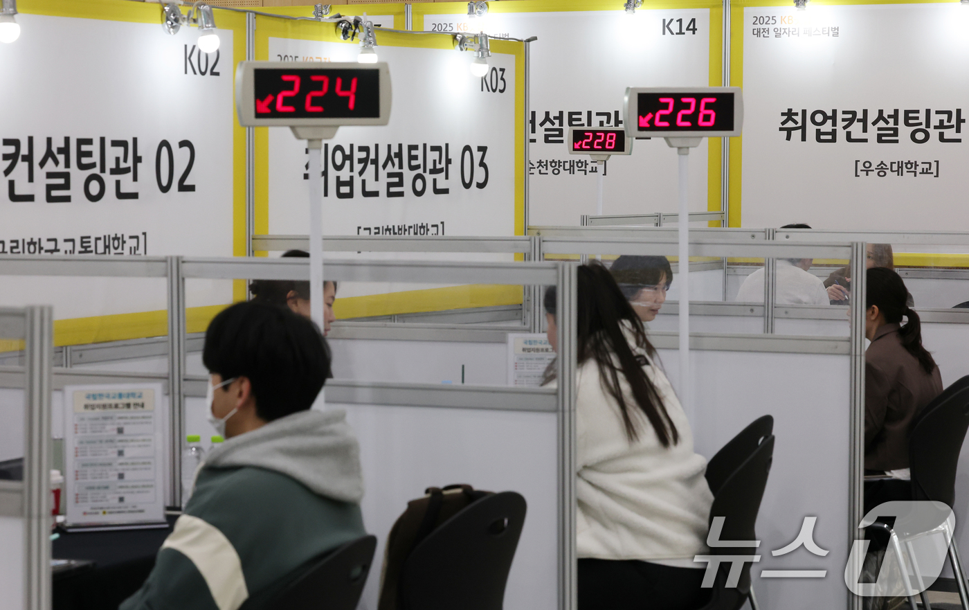 (대전=뉴스1) 김기태 기자 = 19일 대전컨벤션센터에서 고용노동부와 KB국민은행, 대전시가 공동 주최로 열린 '고용노동부와 함께하는 청년의 내일(My Job), 2025 KB굿잡 대전 일자리 페스티벌'에서 구직자들이 취업컨설팅을 받고 있다. 2025.11.19/뉴스1