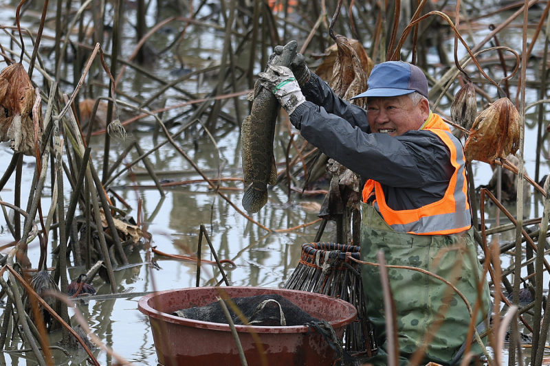 19일 오전 전남 강진군 병영면 중고저수지에서 주민들이 대나무를 줄로 엮어 만든 원통형 바구니인 ‘가래’로 물고기를 잡고 있다.