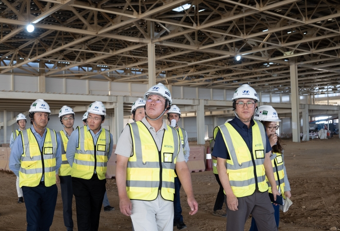 정의선 회장(가운데), 호세 무뇨스 사장(왼쪽에서 첫번째)이 박원균 HMMME 법인장(오른쪽에서 첫번째)에게 사우디 신공장 건설 진행 현황을 들으며, 공장을 둘러보고 있다. 사진=현대차 제공 |