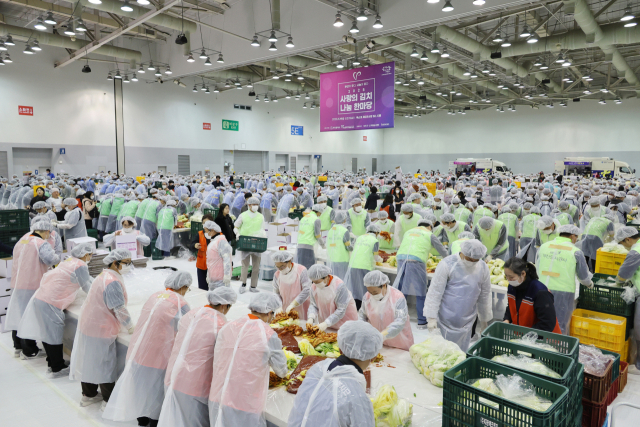 부산시가 겨울철 취약계층을 위한 대표 나눔 행사인 ‘사랑의 김치나눔 한마당’을 19일 벡스코 제2전시장 3층에서 개최했다. 올해로 15회를 맞은 이번 행사에는 기업·기관 임직원과 자원봉사자 등 1000여 명이 참여해 총 31톤, 1만여 포기의 김치를 담그며 온정을 나눴다.