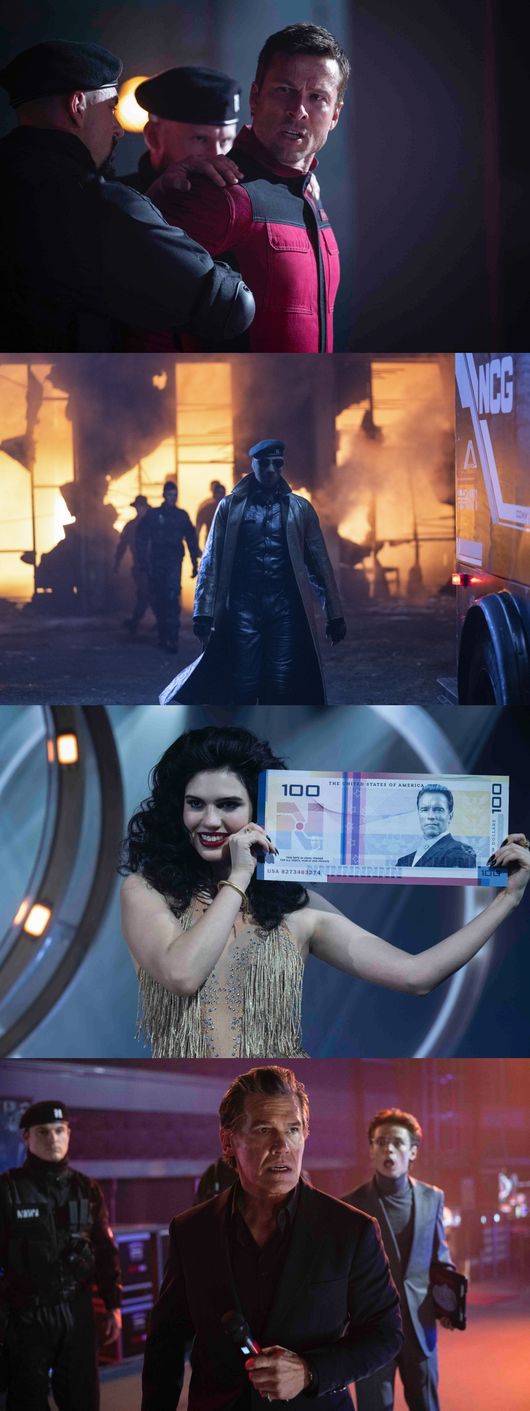 여기에 ‘벤 리처즈’가 도움을 구하기 위해 찾은 암시장 상인 ‘몰리’(윌리엄 H. 메이시)는 오래된 친구와의 우정과 자신도 위험에 처할 거라는 불안 사이에서 갈등하는 듯한 복잡한 얼굴로 흥미를 더한다. 헌터 집단의 리더 ‘맥콘’(리 페이스)이 가면을 쓴 채 거리에 서 있는 스틸은 그의 미스터리한 존재감을 드러내는 한편, ‘더 러닝 맨’ 프로그램의 간판 스타 ‘바비 T’(콜먼 도밍고)가 무대에서 쇼맨십을 뽐내 는 모습과 상금 판넬이 시선을 사로잡는 스틸은 화려한 스케일의 생존 게임을 예고한다.
