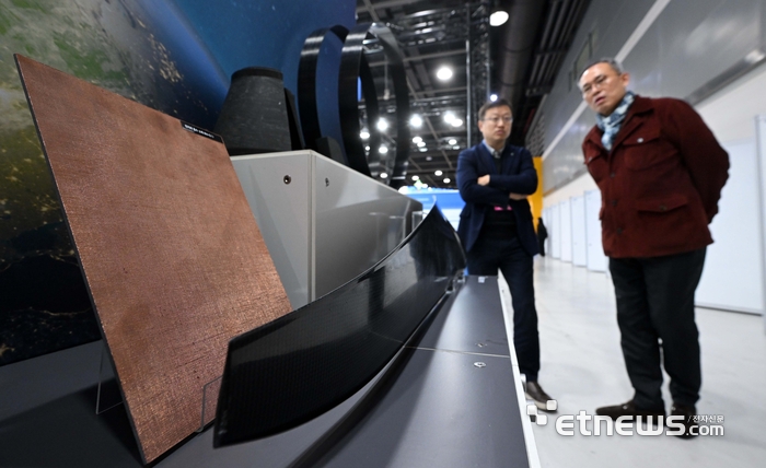 산업통상부가 주최한 '카본 코리아 2025'가 19일 서울 서초구 aT센터에서 열렸다. 한국카본 부스에서 관람객이 탄소섬유 소재의 전자파 흡수 소재, 노즐 내열제, 인공위성 경통 등을 살펴보고 있다.