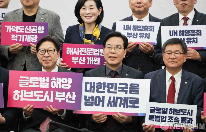 [서울=뉴스핌] 윤창빈 기자 = 송언석 국민의힘 원내대표, 박형준 부산광역시장 등 참석자들이 19일 서울 여의도 국회에서 열린 ‘글로벌 해양허브도시 부산’ 국회 릴레이 세미나에서 기념촬영을 하고 있다. 2025.11.19 pangbin@newspim.com