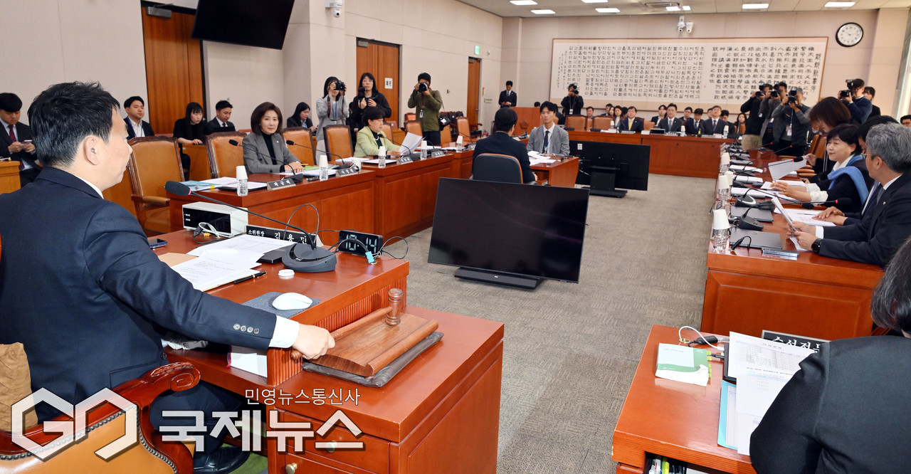(서울=국제뉴스) 19일 서울 여의도 국회에서 열린 제429회국회(정기회) 법제사법위원회 제5차 법안심사제1소위원회에서 김용민 위원장이 의사봉을 두드리고 있다./사진=이용우 기자