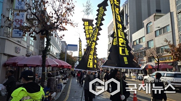 (영동=국제뉴스) 이재기 기자 = 충북 영동송전탑.개폐소반대대책위원회는 19일 영동읍내에서 시위를 갖고 "영동을 희생시키는 수도권 중심 정책, 이제 끝내야 한다"고 주장했다