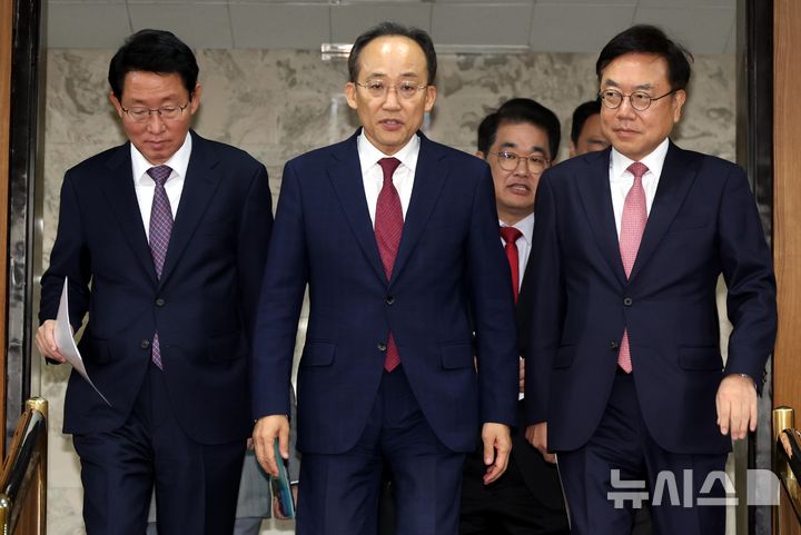 [서울=뉴시스] 조성봉 기자 = 추경호 국민의힘 원내대표를 비롯한 지도부가 12일 오전 서울 여의도 국회에서 열린 원내대책회의에 참석하고 있다. 앞줄 왼쪽부터 김상훈 정책위의장, 추 원내대표, 서범수 사무총장. 2024.11.12. suncho21@newsis.com |