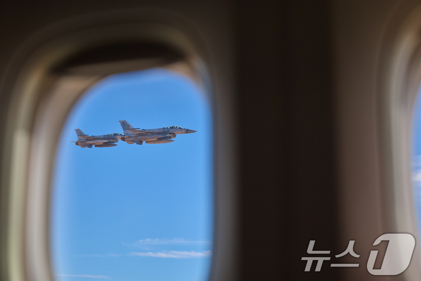 (서울=뉴스1) 허경 기자 = 17일(현지 시간) UAE 측이 이재명 대통령이 탑승한 공군 1호기가 자국 영공에 진입하자 국빈 방문 예우 차원으로 전투기를 출격시켜 호위를 하고 있다. (대통령실 제공. 재판매 및 DB 금지) 2025.11.19/뉴스1