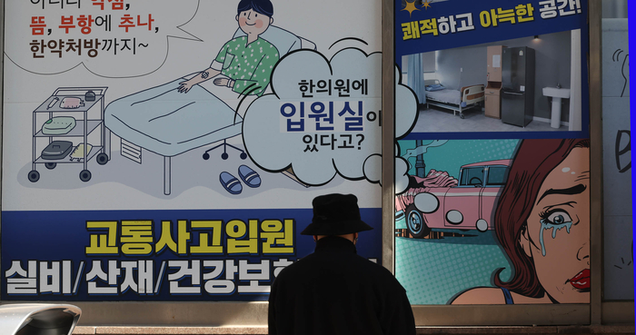 한 한의원 앞에 교통사고 입원 관련 안내문이 붙어 있다. 사진과 기사는 관련 없음. [이충우 기자] |