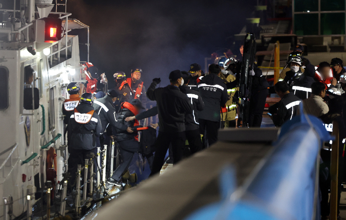 19일 오후 전남 목포시 목포해양경찰서 전용 부두로 여객선 퀸제누비아2호 탑승객들이 구조돼 이동하고 있다. 267명이 탑승한 퀸제누비아2호는 이날 오후 8시 17분께 전남 신안군 장산도 남방 족도에 좌초됐다. 연합뉴스 |