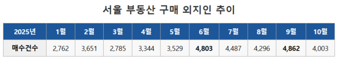 다만 이재명 정부 출범 이후 이어지던 외지인의 서울 유입 흐름과 비교하면 지난달 수치는 확연히 낮다. 실제로 올해 6월 서울 아파트를 매수한 외지인은 4803명으로 연중 가장 많았다. 이후 7월 4487명, 8월 4296명으로 소폭 줄었지만 9월에는 4862명으로 다시 증가하며 규제 발표 전까지는 대체로 상승 흐름을 보였다.