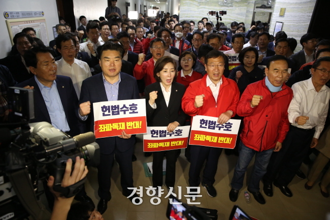 지난 2019년 4월30일 새벽, 국회 정치개혁특별위원회가 연동형 비례대표제 도입 등을 골자로 하는 공직선거법 개정안을 패스트트랙(신속처리안건 지정)에 올리려 하자 나경원 당시 자유한국당 원내대표와 의원들이 회의장 앞에서 반대 구호를 외치고 있다. 이준헌기자 |