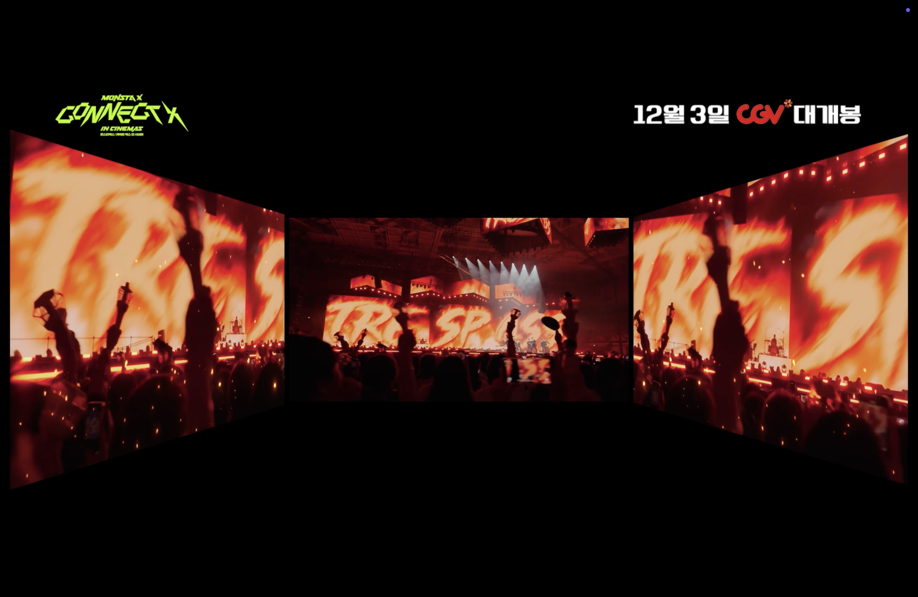 이번에 공개된 SCREENX 예고편은 강렬한 데뷔곡 '무단침입(Trespass)'의 오프닝으로 눈길을 사로잡는다. 왼쪽, 정면, 오른쪽까지 넓게 펼쳐진 스크린을 통해 더욱 확장된 시야로 무대를 감상할 수 있는 SCREENX는 마치 공연장 한가운데 있는 것 같은 생생한 현장감을 전달한다. 특히 각 스크린에 다른 멤버가 잡히는 순간과 정면에 무대, 양면에 관객석이 잡히는 연출처럼 공연장의 다양한 풍경을 보여주는 순간은 공연장에서 미처 다 볼 수 없었던 전체적인 시야를 제공하며 눈을 즐겁게 한다. 여기에 파워풀한 퍼포먼스와 잘 어우러지는 불꽃 효과를 더해 극대화한 무대 연출은 공연장과는 또 다른 매력을 배가시키며 SCREENX에서 만날 영화 <몬스타엑스 : 커넥트 엑스 인 시네마>를 향한 기대를 고조시킨다.