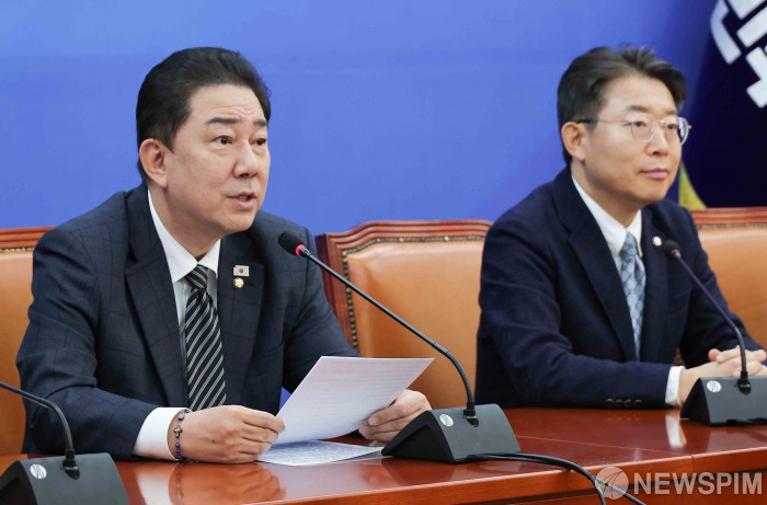 [서울=뉴스핌] 윤창빈 기자 = 김병기 더불어민주당 원내대표가 20일 서울 여의도 국회에서 열린 정책조정회의에서 모두발언을 하고 있다. 2025.11.20 pangbin@newspim.com