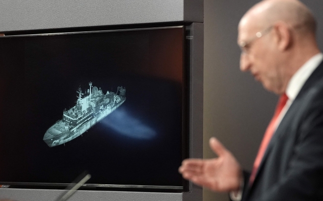 지난 19일 존 힐리 영국 국방장관이 간첩 활동을 한 것으로 의심되는 러시아 선박 얀타르호의 사진을 배경으로 기자회견을 하고 있다. AFP 연합뉴스 |
