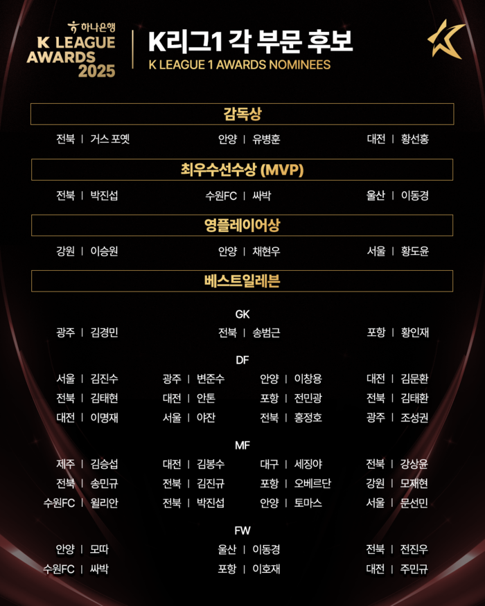 베스트11은 시상식 당일 오전 미리 공개되며, MVP와 영플레이어, 감독상의 주인공은 시상식 현장에서 발표된다. weo@sportsseoul.com