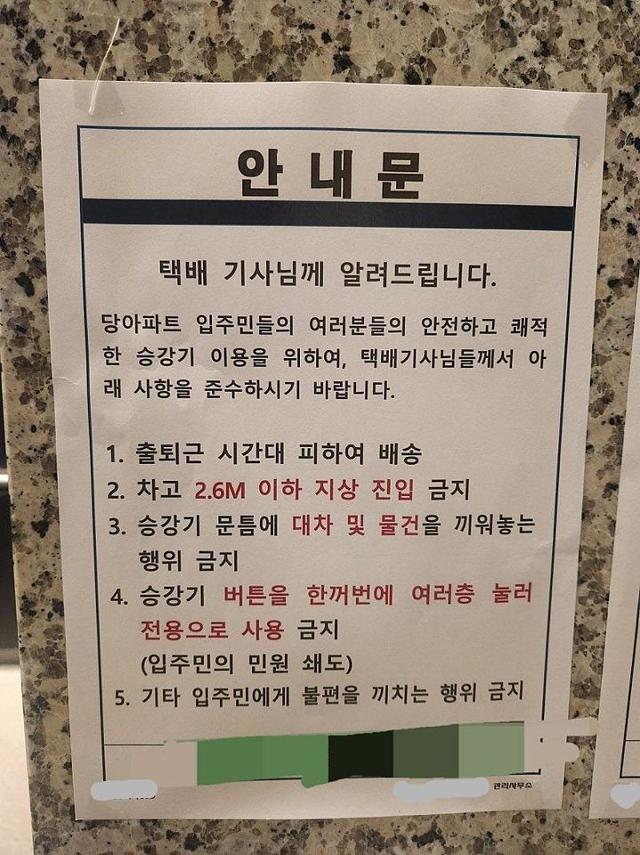 안내문은 '입주민들의 안전하고 쾌적한 승강기 이용을 위해 택배기사님들께서 아래 사항을 준수하시기 바란다'며 5개 사항을 요청하고 있다. △출퇴근 시간대 피해 배송 △차고 2.6m 이하 지상 진입 금지 △승강기 문틈에 대차(택배 운반용 수레) 및 물건을 끼워놓는 행위 금지 △승강기 버튼을 한꺼번에 여러 층 눌러 전용으로 사용 금지 △기타 입주민에게 불편을 끼치는 행위 금지다.