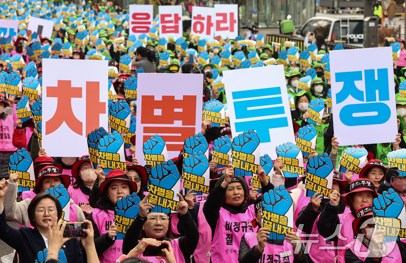 전국학교비정규직연대회의 활동가들이 20일 서울 영등포구 국회 앞 도로에서 열린 학교비정규직 노동자 1차 총파업 대회에서 비정규직 차별 철폐 등을 촉구하며 구호를 외치고 있다. 2025.11.20/뉴스1 ⓒ News1 김도우 기자 |