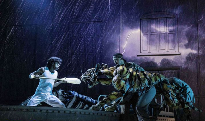 한국 초연을 앞둔 음악극 ‘라이프 오브 파이’의 해외공연의 스틸 장면으로, 대형 퍼펫으로 실감나게 제작된 호랑이와 주인공이 사투를 벌이고 있다. [에스앤코] |