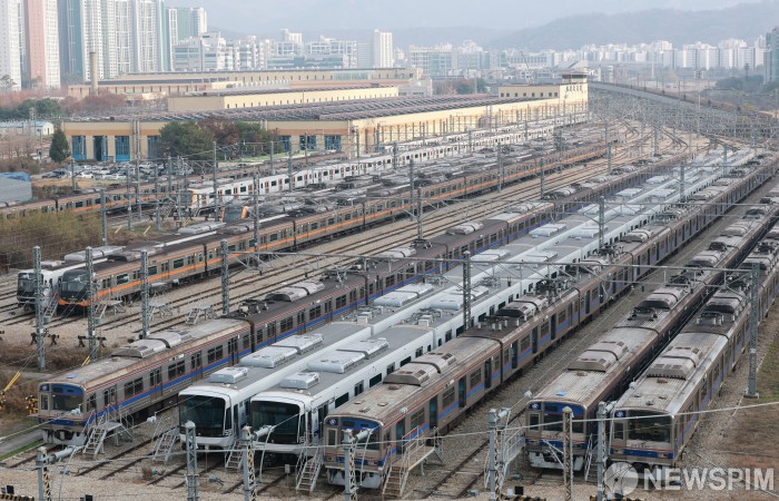 [고양=뉴스핌] 김학선 기자 = 서울지하철 1~8호선을 운영하는 서울교통공사 제1노조인 민주노총 산하 서울교통공사노동조합의 파업 찬반투표가 83.53%로 가결됐다. 1노조는 쟁의대책위 회의를 거쳐 오는 25일 기자회견을 열고 총파업 일정과 총력투쟁 방침을 알릴 예정이다. 앞서 공사 제2노조인 한국노총 소속 서울교통공사통합노조도 지난 14일부터 17일까지 쟁의행위 찬반 투표를 실시했고, 77.97% 찬성으로 가결됐다. 사진은 20일 오후 경기도 고양시 서울교통공사 지축차량기지의 열차 모습. 2025.11.20 yooksa@newspim.com