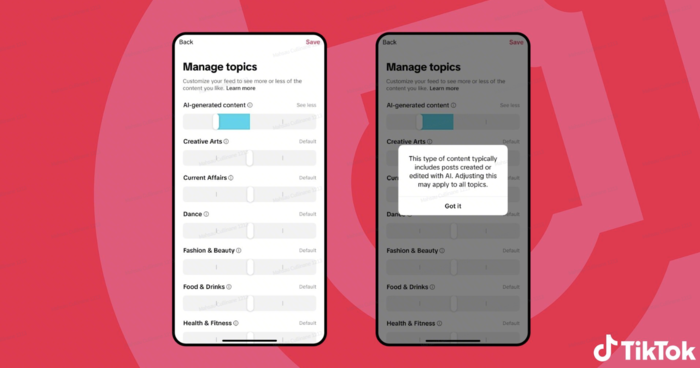 틱톡은 “AI가 생성한 콘텐츠를 선호하는 이용자는 해당 영상을 더 많이 볼 수 있고, 덜 보고 싶은 이용자는 노출 빈도를 낮출 수 있다”고 설명했다. 이 기능은 슬라이더 방식으로 세부적인 빈도 조절이 가능하며, 향후 몇 주 안에 순차적으로 적용될 예정이다.