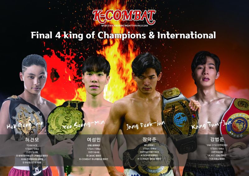 강범준(28·인천 야크짐· 24전 16승 8패) IKMF(미르메컵)-65KG 챔피언, 여성민(25·김해 소룡체육관·15전 11승 4패) 현 K-COMBAT 주니어 웰터급 챔피언, GKMC 챔피언, 장덕준(30·싸이코 핏불스·26전 15승 11패) K-COMBAT 및 KTK 챔피언, 허건모(21·팀 에이스·21전 17승 4패) 전 세계프로킥복싱무에타이총연맹 주니어 웰터급 챔피언, 전국체전 금메달리스트, 전 국가대표 등이다.